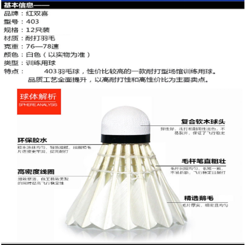 紅雙喜403羽毛球耐打王鵝毛球12只裝 訓練比賽用球